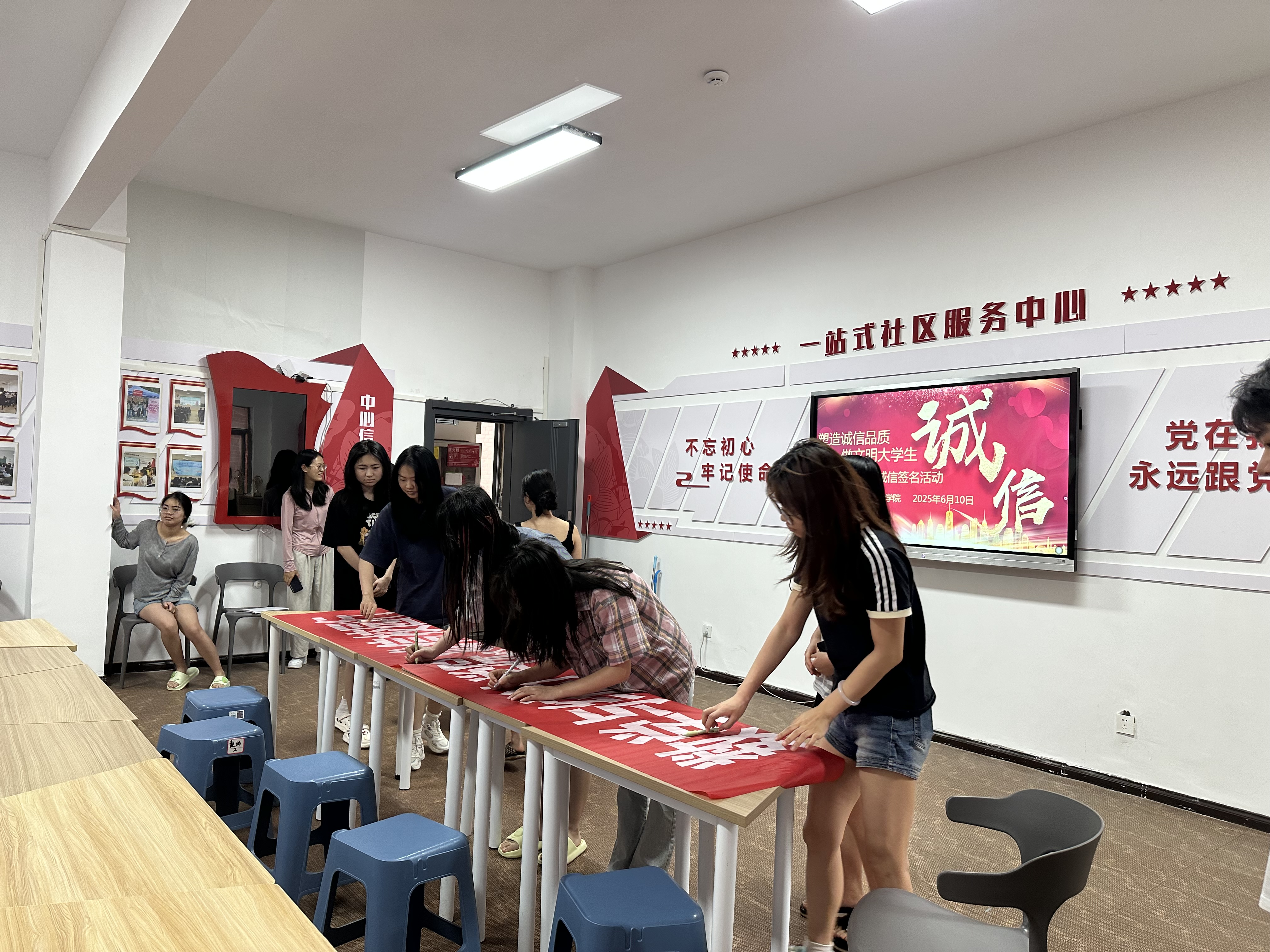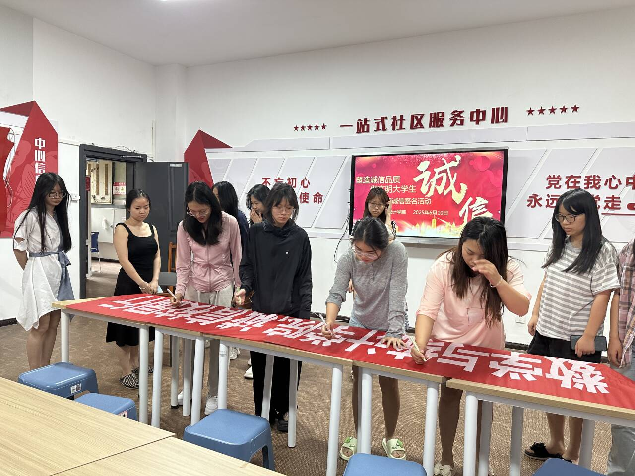 6月10号,yl23455永利在“一站式”员工社区服务中心召开“诚信校园行”员工签名活动,辅导员蔡丽莉、公司资助小组全体成员、各年级员工代表参加。