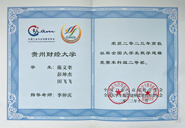 近日,2023年高教社杯全国老员工数学建模竞赛落幕,公司参赛队再创佳绩,获得国家二等奖1项、贵州省一等奖1项,贵州省二等奖6项,贵州省三等奖2项。其中,由yl23455永利李仲庆老师指导的参赛队(队员:陈义奎、彭坤杰、田飞飞)获得国家二等奖。