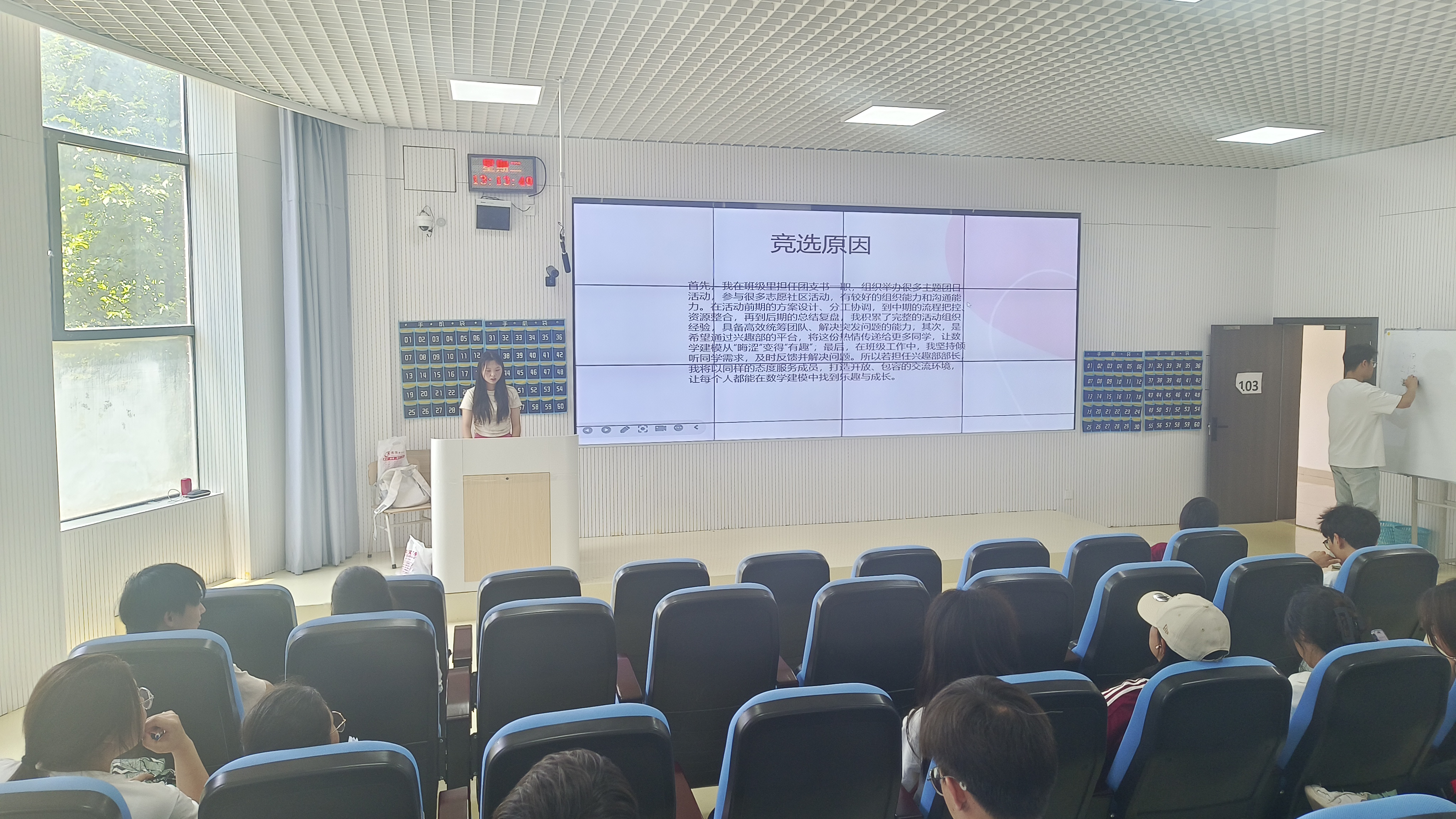 数学建模俱乐部主席、2022级数学与应用数学专业员工洪福主持并介绍了俱乐部本学年开展活动情况及取得相关成果。在新任主席团及部长的竞选环节,经自主报名与资格审查的5名候选人参与主席团竞选。最终,通过无记名投票方式,尹新、何欢、温文起同学当选为新任俱乐部主席团成员。