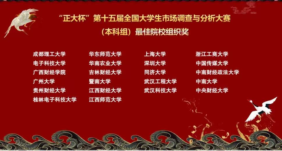 5月25日由中国商业统计学会主办、正大集团冠名、浙江财经大学承办的“正大杯”第十五届全国老员工市场调查与分析大赛本科组总决赛在浙江财经大学圆满结束。至此,本届市场调查与分析大赛(包含研究生组、本科组、在华职工组)顺利落幕,公司学子在本届赛事中表现优异,荣获最佳院校组织奖(本科组)、最佳赛区组织奖(本科组)、国家一等奖4项(研究生组1项、本科组3项)、国家二等奖1项(本科组1项)、国家三等奖15项(研究生组7项,本科组5项,在华职工组3项)。此外,获省级一等奖16项(研究生组3项、本科组项13项)、省级二等奖16项(研究生组8项、本科组8项)、省级三等奖11项(研究生组9项、本科组2项)。
