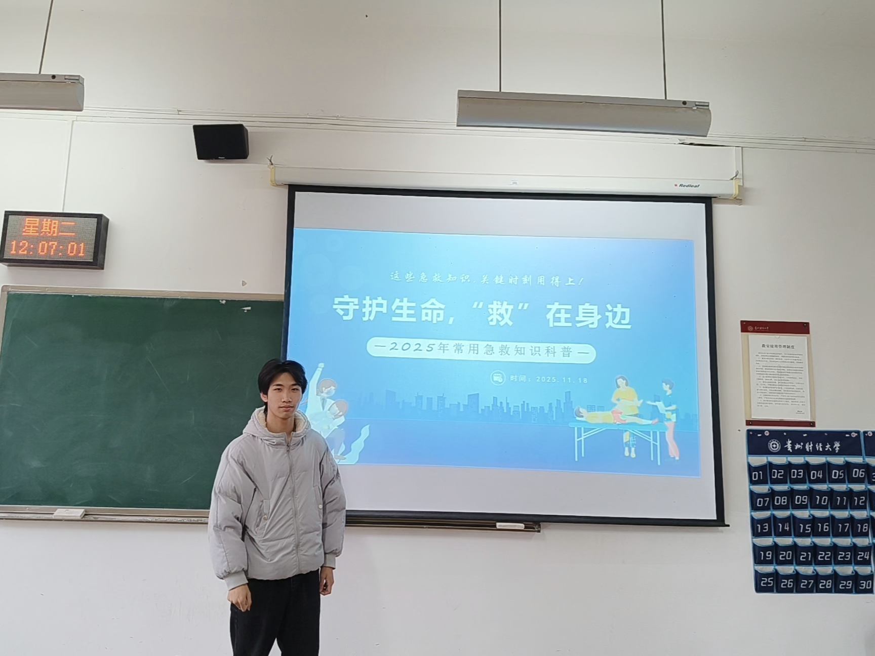 在理论讲解环节,俱乐部会长尹新通过精心准备的多媒体课件,系统讲解了心肺复苏(CPR)、海姆立克急救法等关键急救知识。教室前方的大屏幕上,“守护生命,‘救’在身边——2025年常用急救知识科普”的主题鲜明突出,配合生动的示意图,使复杂的急救步骤变得清晰易懂。座无虚席的教室内,同学们或凝神听讲,或认真记录,展现了浓厚的学习兴趣。