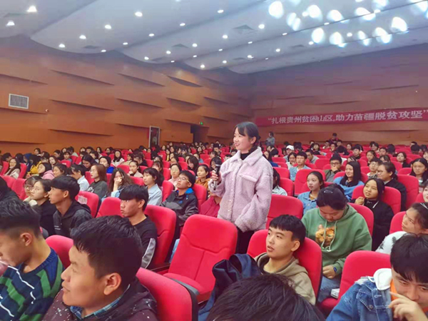 崔洋以“扎根贵州贫困山区,助力苗疆脱贫攻坚”为题,分享了他投身贵州脱贫攻坚主战场的经历及感受,讲述了他的初心和使命。崔洋用“朝乾夕惕”“坚贞无咎”“反身修德”“正位凝命”十六个字表达了自己投身脱贫攻坚工作的感想和体会。2016年,他主动放弃优渥的工作和生活条件,从北京到贵州挂职任台江县常委、副县长,他克服饮食、语言、文化、生活习惯差异诸多难关,及时转换角色融入工作,着力发挥自身专业优势和作用,助力脱贫攻坚。挂职两年期间,为当地老百姓做了大量实事、好事。他表示,通过自己的努力,一方面让老百姓有实实在在的获得感,另一方面也让自己的综合素质得到相应提升,从而有实实在在的价值感、成就感。在交流互动环节,他一一回应了同学们的问题。崔洋鼓励同学们当前要学习好专业知识,为今后践行自己的初心使命打下坚实基础;他鼓励同学们毕业后积极投身到大可为的乡村振兴事业中去,充分施展自己的抱负和才华。