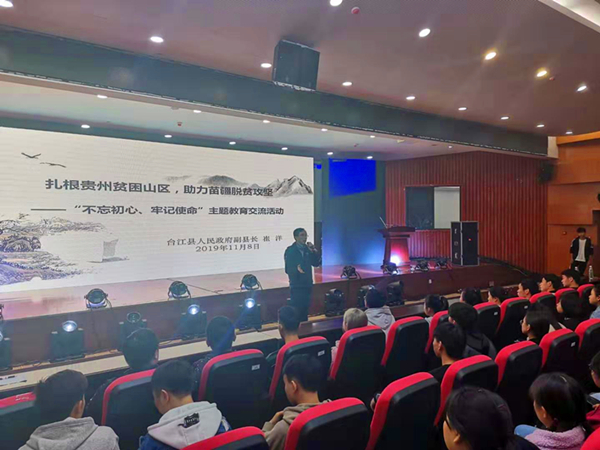 11月8日,台江县副县长崔洋应邀到公司图书馆报告厅作题为“扎根贵州贫困山区、助力苗疆脱贫攻坚——‘不忘初心、牢记使命’主题教育交流活动”。公司党委组织部、计财处、工商公司、会计公司、信息公司以及yl23455永利师生约500名员工参加该活动,活动由信息公司党委书记卿春主持。
