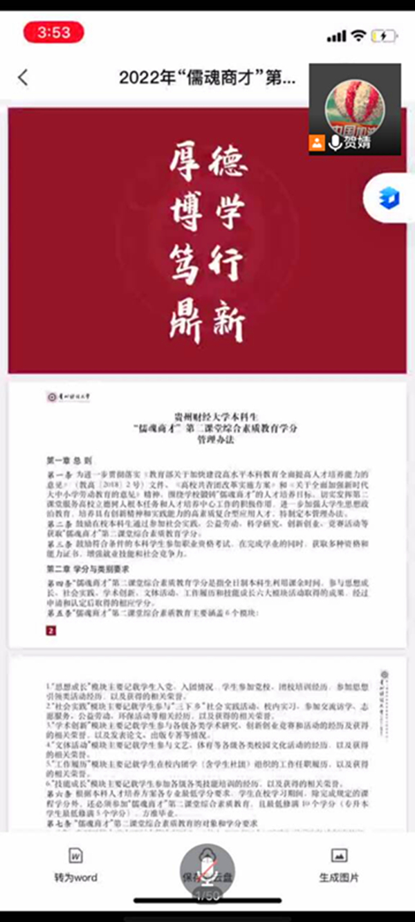 随后,贺婧向同学们介绍了员工手册的用法、用处以及在日后的老员工活中同学们该如何去学习,并对公司学分学籍考评制度以及毕业条件进行说明,方便大家规划老员工活。贺婧强调“青年大学习”的重要性,鼓励大家积极参与社会实践活动,进行有实际意义的学术创新。最后,贺婧详细介绍了“儒魂商才”第二课堂综合素质教育学分认定标准。
