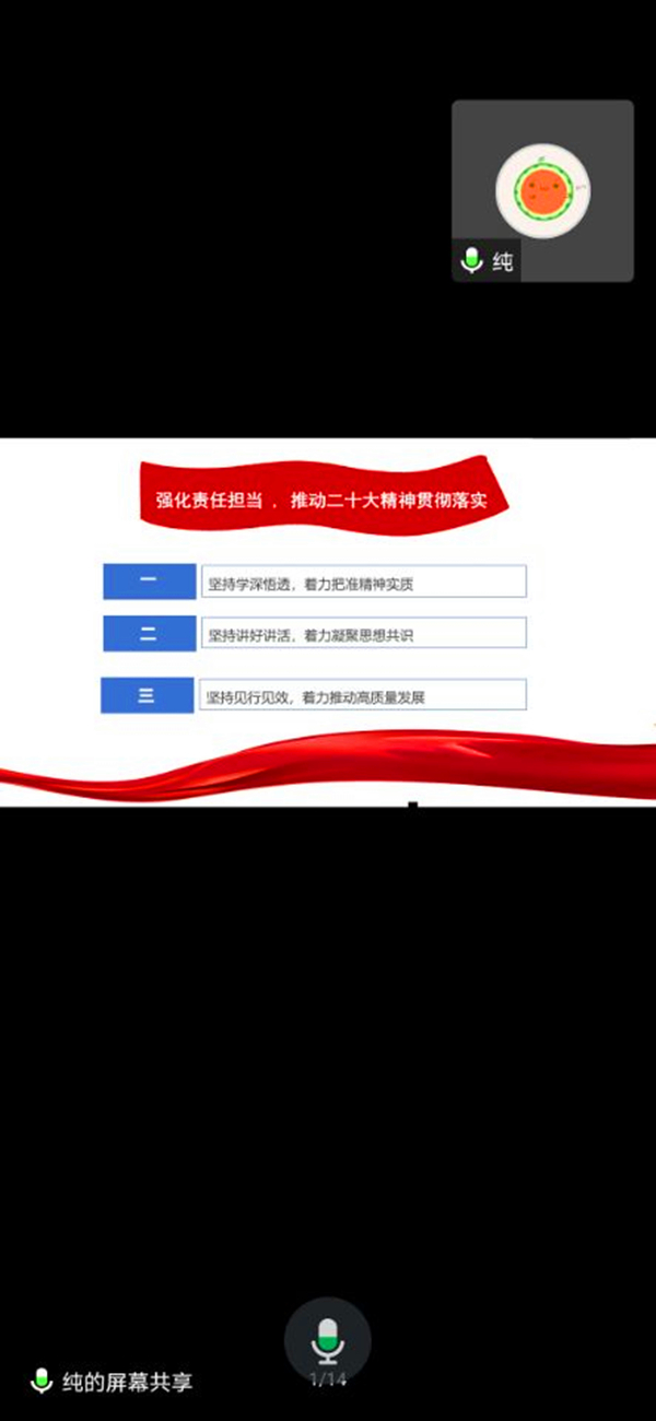 11月22日,公司党委副处级专职组织员余纯采用线上线下的结合方式,在志学楼304会议室、腾讯会议为联系的党支部和班级宣讲党的二十大精神。公司本科生第二党支部全体党员、2021级统计学班、2022级统计学1班、统计学2班全体员工参加。