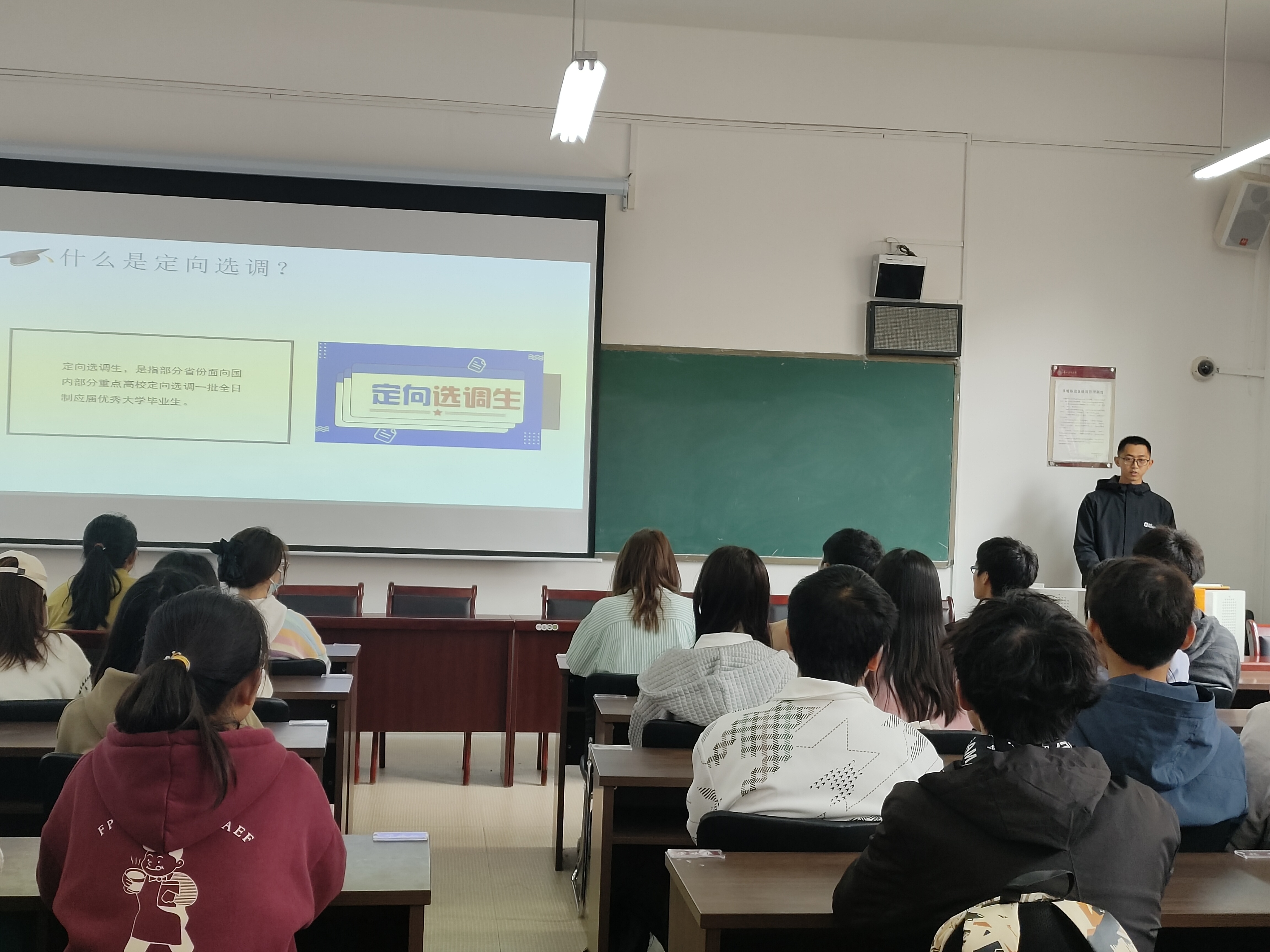 会上,卢涛分享了其在校学习经历及参加定向选调的感悟,希望同学们清晰目标定位,特别就面试技巧、仪容仪表等方面给同学们提出建议,并强调面试时一定要充满阳光,充分展示自己的优势。