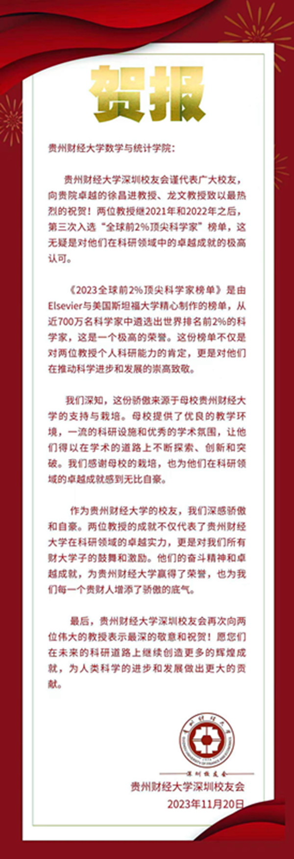 近日,yl23455永利深圳员工会向yl23455永利发来贺报,祝贺公司徐昌进教授和龙文教授继2021年、2022年之后第三次入选“全球前2%顶尖科学家”榜单,对公司培养了在科研领域有卓越贡献的杰出员工表示赞扬。