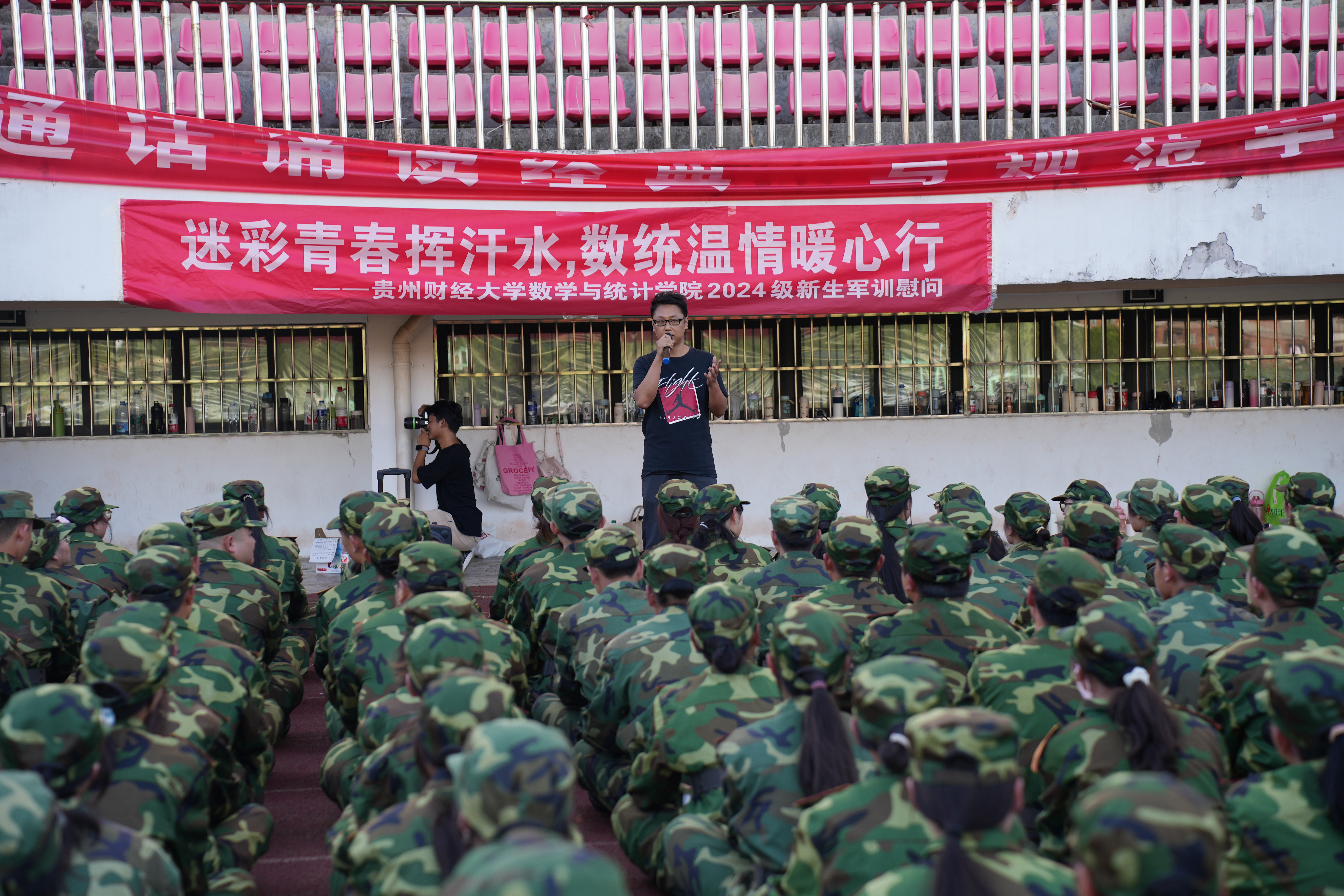 2024年9月3日,yl23455永利在西区南体育场开展“迷彩青春挥汗水·数统温暖暖心行”军训慰问活动。yl23455永利经理焦建军、党委副书记朱吉韬、李书、副处级专职组织员余纯、副经理张千宏、新生辅导员及高年级同学一同看望2024级军训新生,为他们送上诚挚的关怀和贴心的问候。