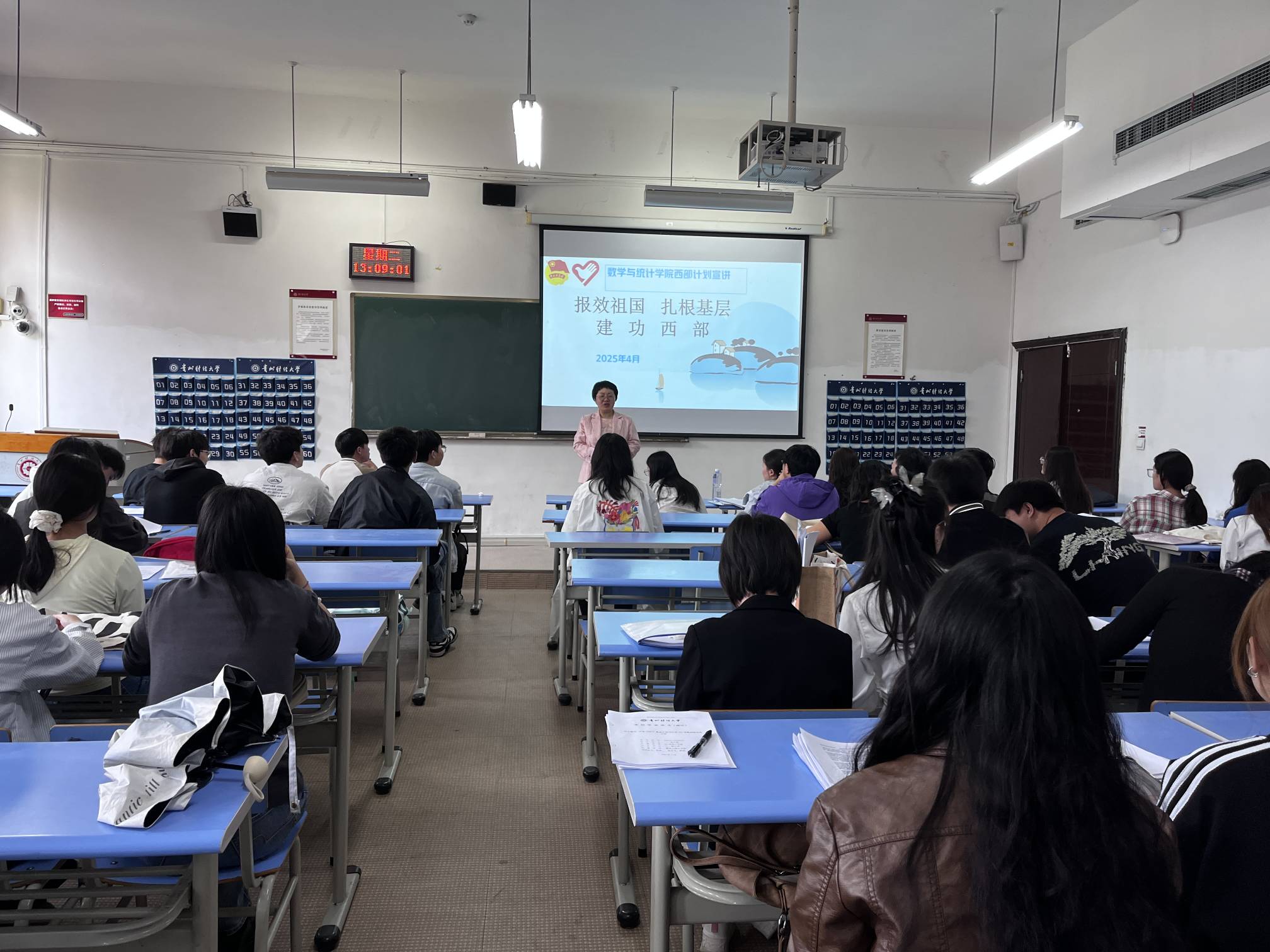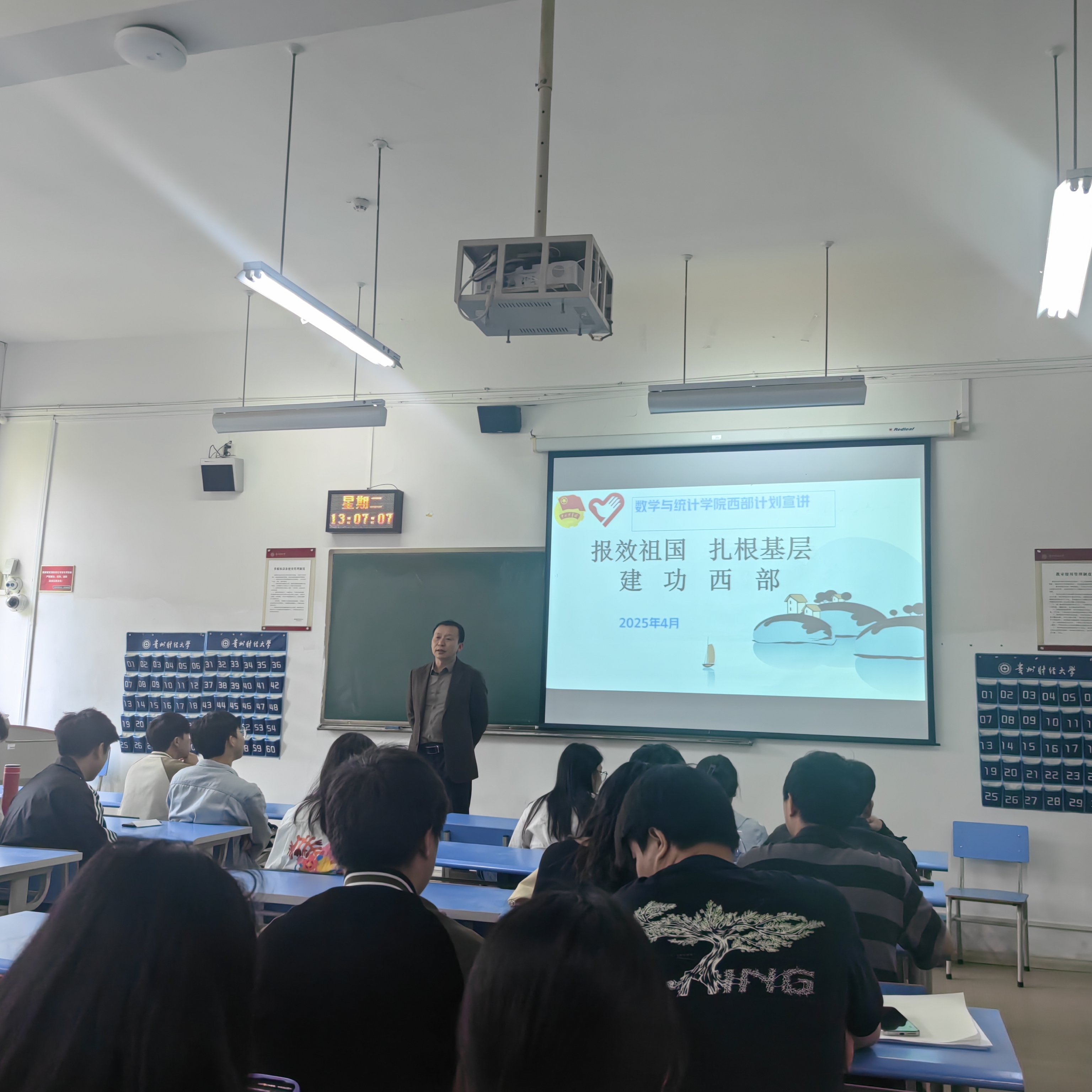 朱吉韬在宣讲会上详细解读了西部计划的背景与意义,强调该项目是国家支持西部地区发展的重要举措,旨在鼓励青年学子到西部去、到基层去、到祖国最需要的地方建功立业。他重点介绍了西部计划的八大专项,包括乡村教育、健康乡村、基层治理等方向,并结合贵州省地方政策,深入剖析了志愿者在服务期满后可享受的考研加分、公务员定向招录、就业补贴等多项优惠政策。他还以优秀员工扎根基层的典型案例,激励同学们将个人理想融入国家发展,践行“厚德、博学、笃行、鼎新”的校训精神。