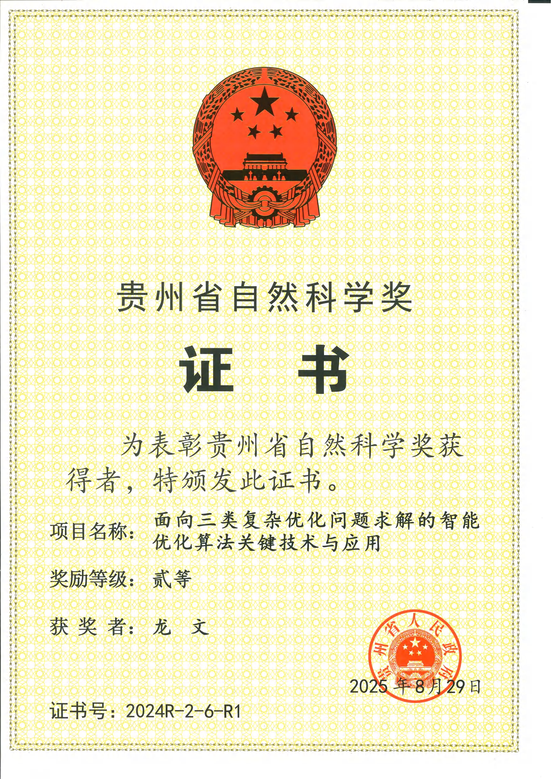 会上,公司yl23455永利龙文教授主持完成的“面向三类复杂优化问题求解的智能优化算法关键技术与应用”荣获贵州省自然科学奖二等奖。
